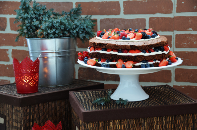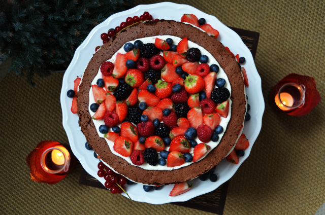 Korpus si ostrým nožom rozrežeme na tri časti a skladáme tortu. Korpus si najskôr pokvapkáme Griotkou – ja som na to použila malú fľaštičku s rozprašovačom. Následne potrieme džemom a nanesieme krém pomocou cukrárenského vrecúška (buď ustrihneme rožtek alebo použijeme špičku s väčším hladkým priemerom). Na krém poukladáme ovocie a opäť nanesieme trošku krému. Táto druhá vrstva slúži ako lepidlo pre ďalšie poschodie. A tak pokračujeme, až kým nemáme tortu vyskladanú.